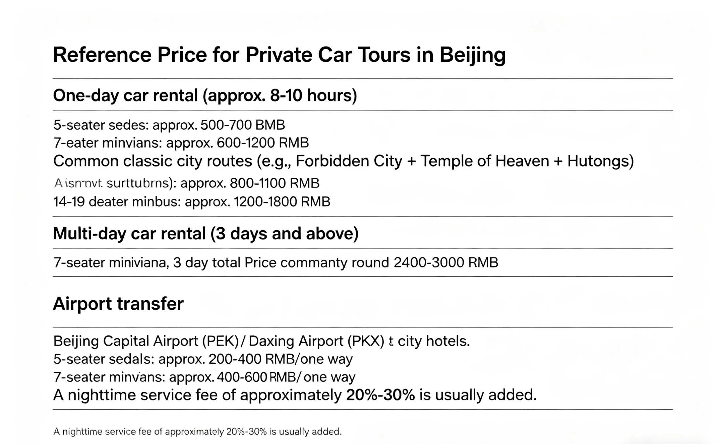 Charter car prices in Beijing vary depending on the vehicle type, service duration, distance, season, and whether it crosses district boundaries. The following is a reference for common market conditions in 2026: